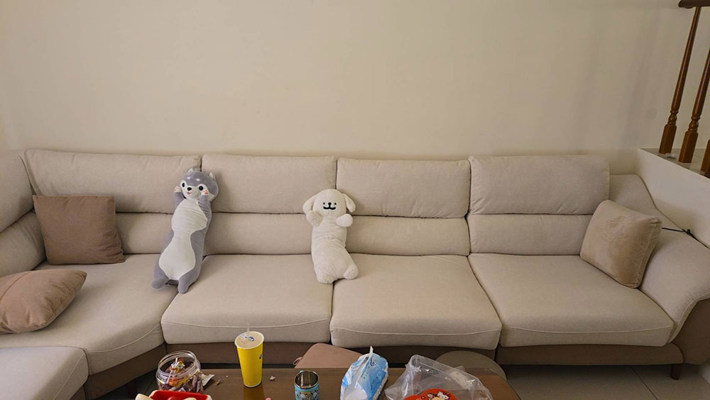 林先生選擇雷克雅貓抓布模組沙發,最大亮點在於大尺寸與高彈性配置,模組化設計搭配寬敞座深,讓沙發不只是坐,更能躺、能放鬆,提升整體生活舒適度,雙色設計兼具美觀與耐用性,加上穩定支撐的坐感,是適合大坪數空間的高CP選擇。