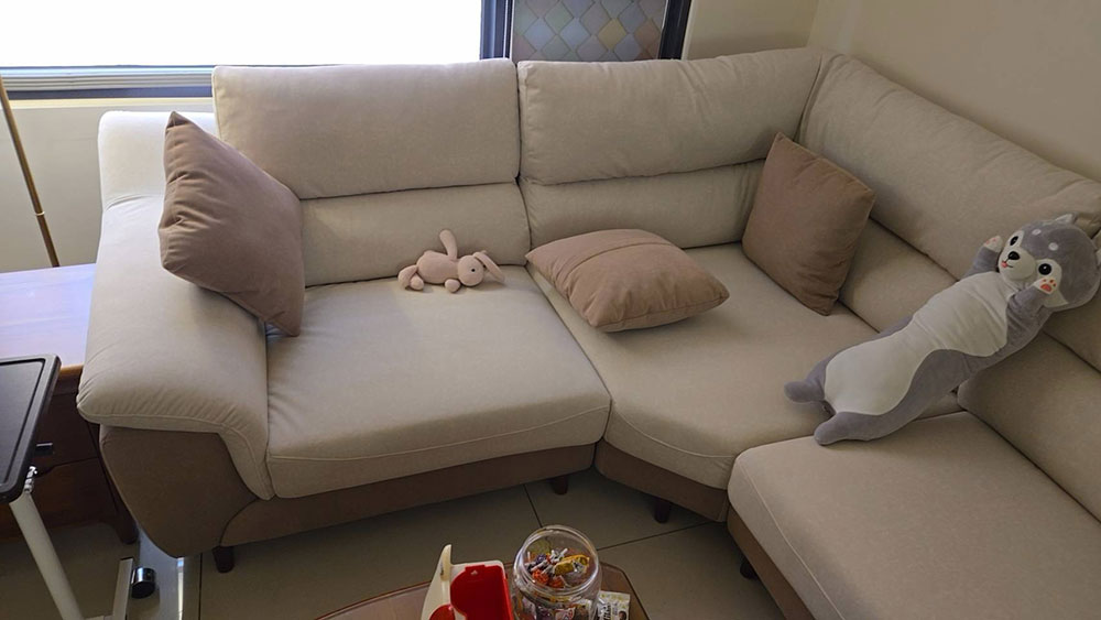 這次在 YKS 下手了這組 L 型沙發,送來家裡後真的比想像中還要大、還要舒服。